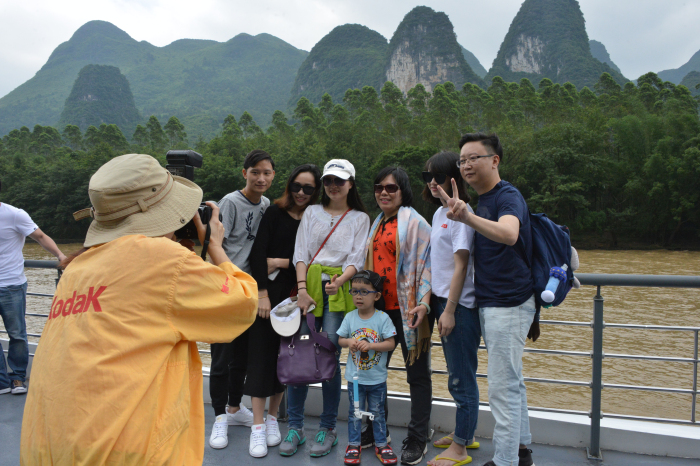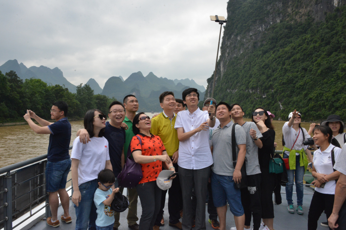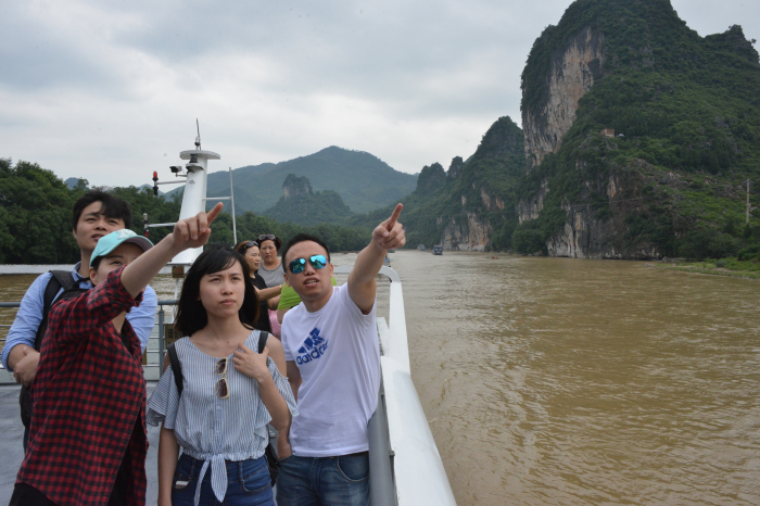 沿途美不勝收的山水風(fēng)光,吸引了建藝人紛紛登上游船的頂層甲板,尤其在著名的“九馬畫山”景點(diǎn),大家更是爭先恐后的拍照留念。有趣的是,拍照之余,大家還興致勃勃的“數(shù)馬”,大自然的神奇造化,加上人的豐富聯(lián)想,一個(gè)絕美無比的自然奇觀這就這樣展現(xiàn)在了眼前,令人不得不贊嘆自然的神奇,更對(duì)漓江沿途的美景稱奇不已。