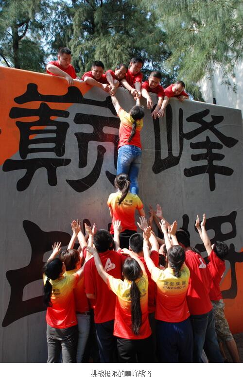 當教練宣布完挑戰規則后,建藝人集體陷入沉思,在大家的心中都有這樣一個疑問:單憑“人墻”,我們能完成挑戰嗎?看到蔓延在團隊中的顧慮陰霾,作為本次挑戰領隊的集團常務副總裁田力與共同參加挑戰的行政管理中心總監趙紂瑜共同制定了挑戰策略,并在最短時間內將隊伍分工,確定人墻人員及攀爬人員,通過對團隊資源的合理分配,迅速調整了團隊成員們的心理狀態。“我們一定能成功!”的堅定信念更是將先前的顧慮陰霾一掃而光。在教練一聲令下后,第一名攀爬人員在人墻的幫助下迅速爬上墻壁,打響了這場終極挑戰的第一槍!