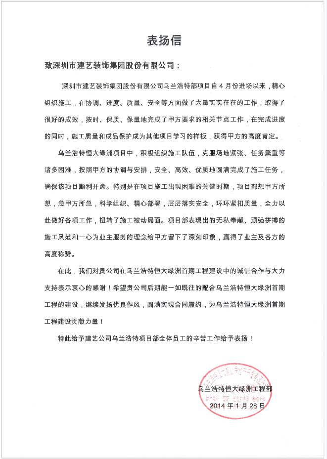 一封來自烏蘭浩特恒大綠洲工程部的表揚信