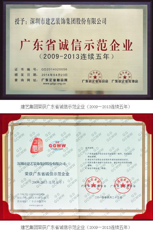 注重品牌與誠信,是建藝集團一直以來都遵循的發展準則。多年來,以品質管理、誠信經營為主旨,建藝集團在建筑裝飾領域銳意進取,為廣東經濟社會發展推注源源動力。同時,憑借自身的誠信經營表率,建藝集團還以身作則,積極為廣東省企業誠信體系建設做出應盡貢獻。在4月23日舉辦的第20屆廣東省“企業家活動日”大會上,一批2013年度廣東省優秀企業、優秀企業家、最佳誠信企業、誠信示范企業受到表彰,建藝集團憑借出眾的誠信管理體系及卓越的行業發展表率,再次得到肯定,喜獲“2013年度廣東省優秀企業”及“廣東省誠信示范企業(2009-2013連續五年)”殊榮,為建藝集團2014年“榮譽簿”譜寫了濃墨重彩的一筆。