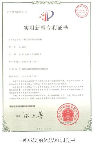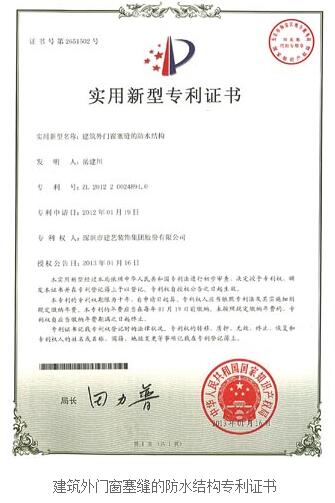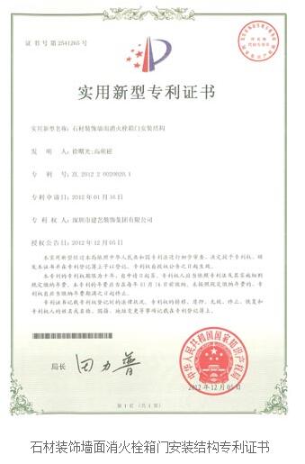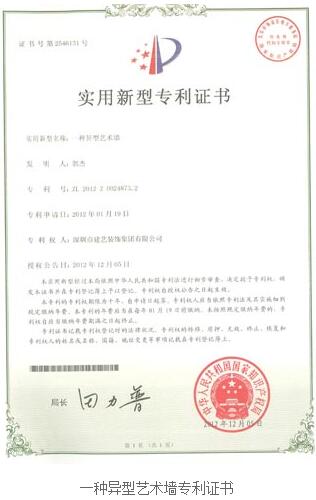 近日,建藝集團有四項實用新型專利正式獲得國家知識產權局的授權。該四項專利分別為:一種天花燈的安裝結構(專利號:ZL201220024872.8)、一種異型藝術墻(專利號:ZL201220024873.2)、石材裝飾墻面消火栓箱門安裝結構(專利號:ZL201220020020.1)、建筑外門窗塞縫的防水結構(專利號:ZL201220024891.0)。