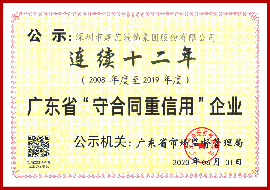 建藝集團(tuán)連續(xù)十二年榮獲廣東省“守合同重信用”企業(yè)稱號