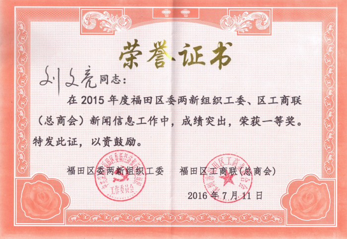 建藝集團企業(yè)文化部專員劉文亮獲得的一等獎證書
