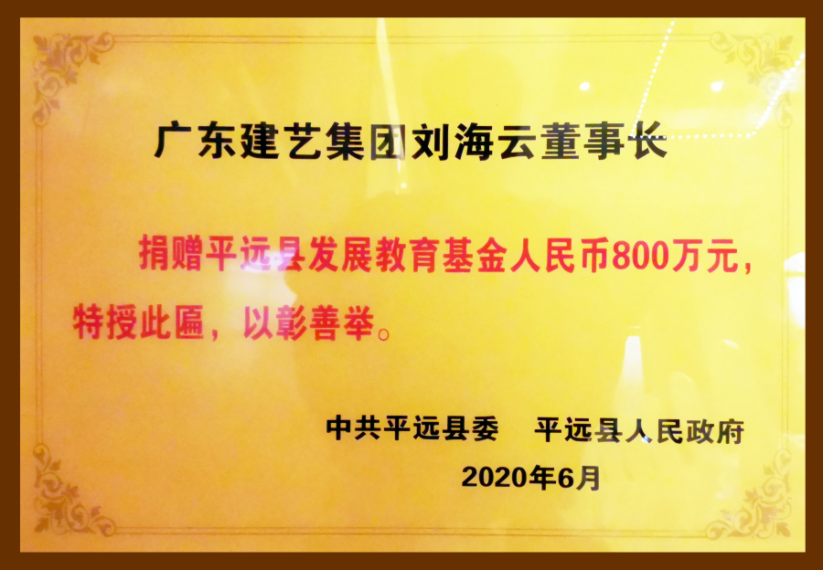 心系平遠(yuǎn),大愛無疆;關(guān)注經(jīng)濟(jì),振興教育。從早年廣東建藝石材落戶平遠(yuǎn),到2015年廣東建藝科技工業(yè)園項(xiàng)目動(dòng)工,再到2020年與縣政府簽訂總投資額1億元的裝配式建材生產(chǎn)線投資協(xié)議……在經(jīng)濟(jì)振興領(lǐng)域,劉海云董事長為平遠(yuǎn)地方經(jīng)濟(jì)發(fā)展傾注了大量心血,建藝科技、建藝筑工、建藝石材共投資約3億元。與此同時(shí),在民生保障與慈善捐贈(zèng)上,劉海云董事長更是多年來始終如一地向平遠(yuǎn)持續(xù)輸出愛心,并力所能及地支持、助力當(dāng)?shù)胤鲐毠ぷ鳌T缭?012年,劉海云董事長就資助100萬元善款用于平遠(yuǎn)縣大佛寺建設(shè);在2019年度“廣東扶貧濟(jì)困日”活動(dòng)中,劉海云董事長再次伸出援手,向平遠(yuǎn)縣仁居鎮(zhèn)捐贈(zèng)善款100萬元,用于支持當(dāng)?shù)氐缆窐蛄航ㄔO(shè);2020年,當(dāng)新冠肺炎疫情席卷平遠(yuǎn)縣境之時(shí),劉海云董事長更是第一時(shí)間指示相關(guān)人員向平遠(yuǎn)縣紅十字會(huì)援助1萬只口罩,以解當(dāng)?shù)匾咔榉揽禺?dāng)務(wù)之急……