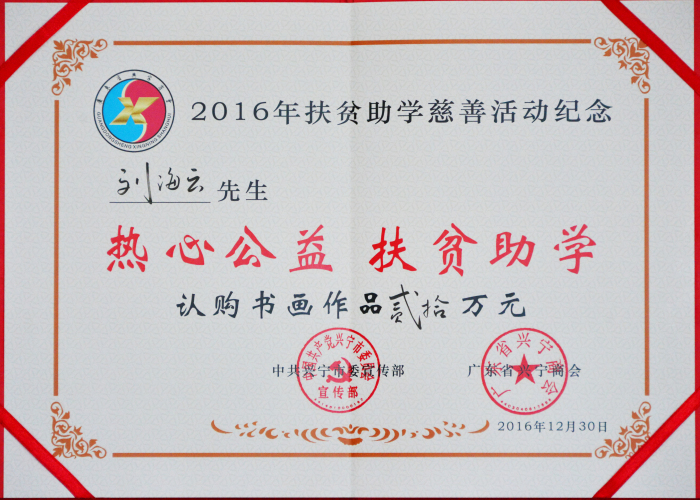 劉海云董事長(zhǎng)榮獲的捐資榮譽(yù)證書