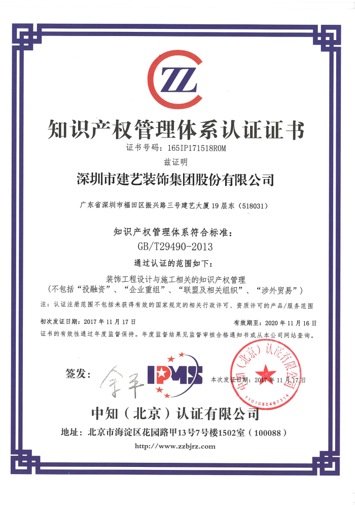 鑒于此,建藝集團于2016年年底著手知識產權管理體系引用與推行的準備工作,2017年3月開始在集團各管理職能部門貫徹實施,并于2017年11月17日通過中知(北京)認證有限公司首次認證。