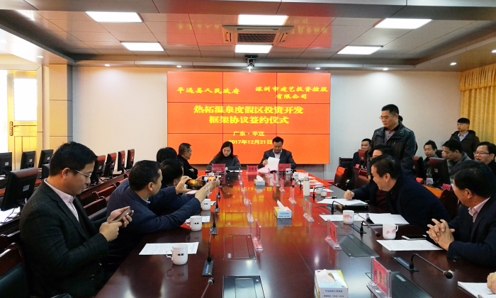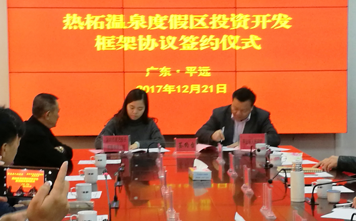 12月21日上午,廣東省平遠縣與深圳市建藝投資控股有限公司成功舉行簽約儀式,雙方就熱柘溫泉度假區投資開發項目簽署了框架協議。