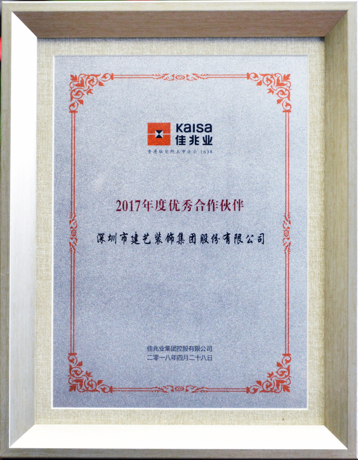開創(chuàng)新時代的良好發(fā)展格局,離不開合作伙伴的匠心精神。本著公平公正的原則,佳兆業(yè)集團(tuán)對所有合作伙伴進(jìn)行嚴(yán)格評估,峰會現(xiàn)場頒發(fā)了“2017年度優(yōu)秀合作伙伴”等五大獎項(xiàng),以表彰2017年度在品質(zhì)、設(shè)計(jì)、服務(wù)、貢獻(xiàn)、長期合作等方面做出杰出貢獻(xiàn)的合作伙伴及優(yōu)秀個人。建藝集團(tuán)憑借卓越的合作表現(xiàn)及長期以來對品質(zhì)的無懈追求,榮獲“2017年度優(yōu)秀合作伙伴”獎。