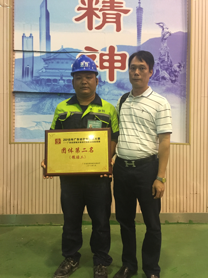 在深圳市住房和建設局統籌指導下,深圳建筑業協會和深圳市裝飾行業協會快速組織開展優秀工匠的推選及組隊工作,經過層層選拔,鑲貼工及鑲貼工創新創意項目工種最終確定12名參賽選手代表深圳工匠出征。建藝集團 “明星”工匠楊聰彬作為12名參賽選手之一代表深圳出征廣東省職業技能大賽,并在本次技能大賽鑲貼工比賽中斬獲了全省團體第二名。