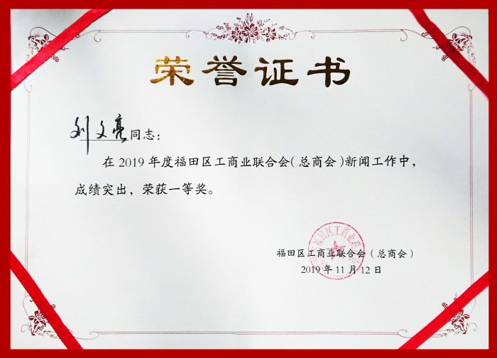 培訓后,區工商聯領導對2019年度福田區工商聯(總商會)優秀信息員進行表彰并頒發了榮譽證書。建藝集團榮獲福田區工商聯(總商會)新聞工作第一名,這是建藝集團連續第四年蟬聯第一。