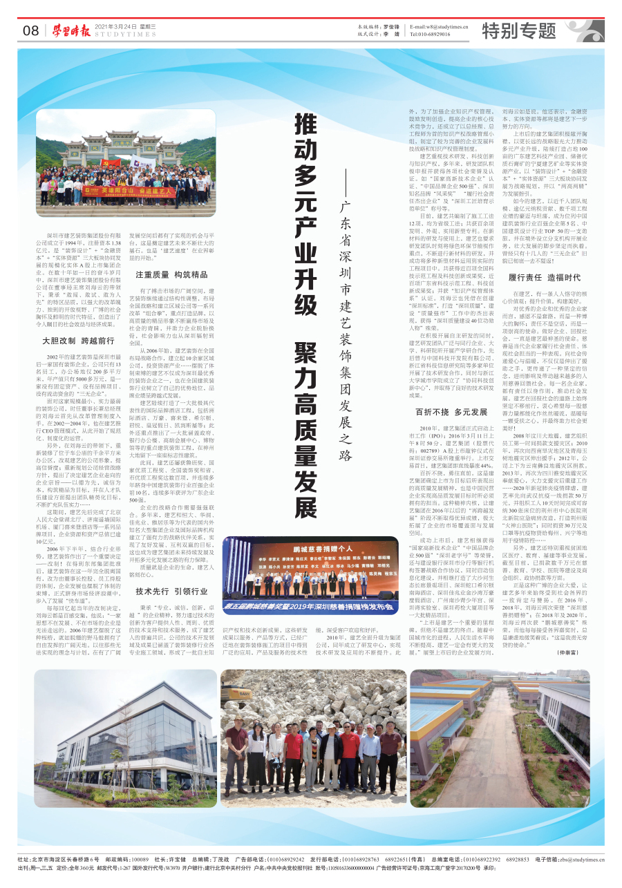 24日,由中共中央黨校主辦,面向全國,服務全黨,國內外公開發行,全黨唯一專門講學習的報紙媒體——《學習時報》特別用整版篇幅,詳細報道了建藝集團自成立以來,依托引領行業的先進發展思維,佐以多元產業升級,積極聚力高質量發展并造福時代的先進事跡,在社會引起強烈反響。