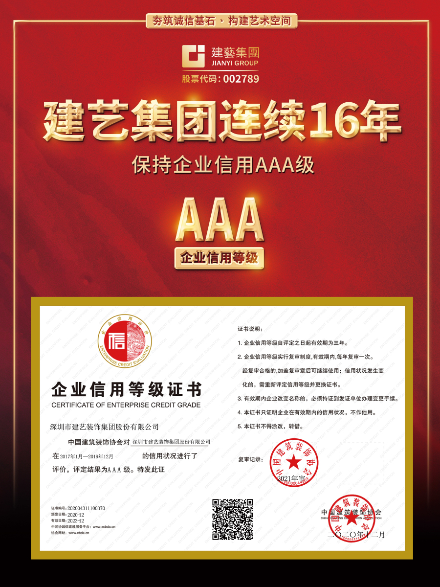 日前,中國建筑裝飾協會發布了《2021年度(第二批)建筑裝飾行業信用評價復評公告名單》,建藝集團等近三百家優秀裝飾企業獲行業最高信用等級——AAA級評定,這也是建藝集團連續16年保持企業信用AAA級。
