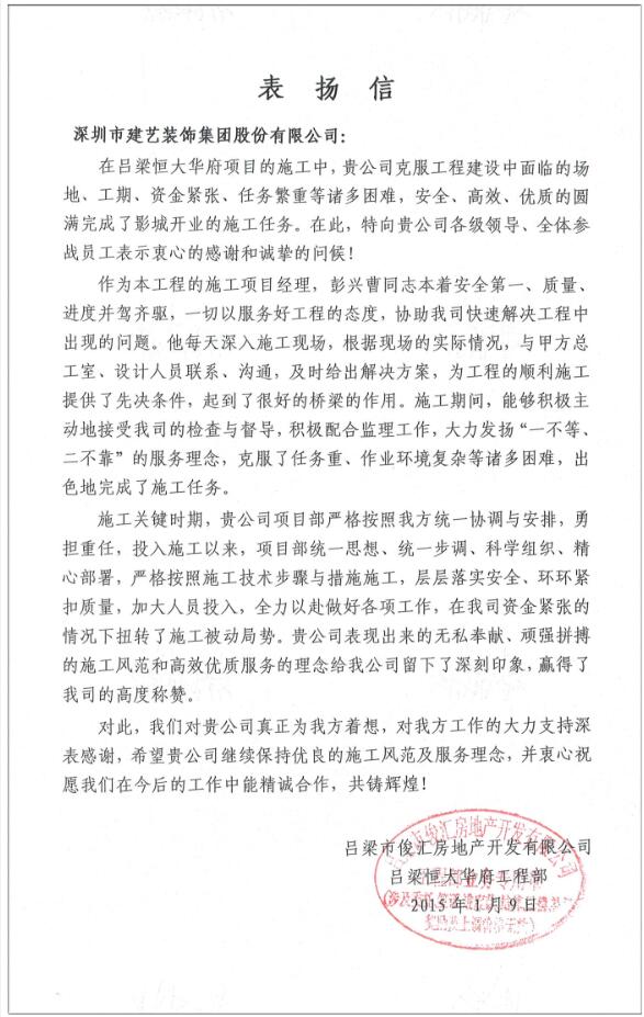 我司承建的山西呂梁恒大華府影劇院項目,在面臨前期相關方進度嚴重滯后等嚴峻挑戰時,項目部工程人員克服種種困難,不怕苦,不怕累,精心組織,科學安排,全力沖刺,全力配合,最終憑借努力付出,達到了業主方的進度目標要求,確保了影劇院準時開業。業主方對我司工程人員的高超管理水平以及對項目工作的高度負責任精神表示極大認同,對我司在該項目上所做出的巨大努力和突出表現表示了高度贊揚!
