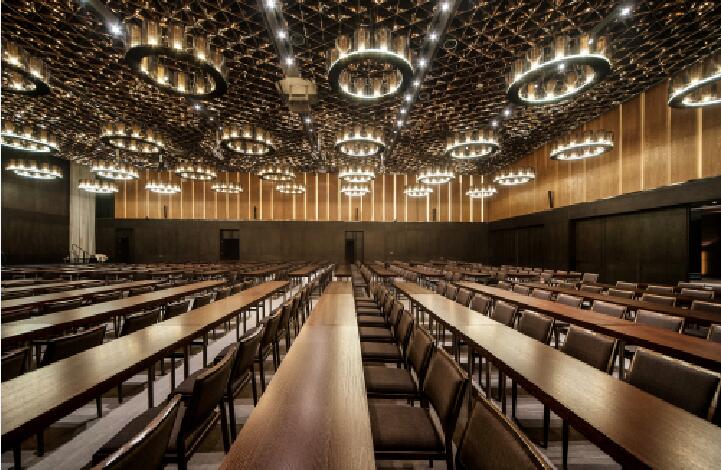 三層宴會廳極具特色。宴會廳約八百平方米,墻面下半部分是深咖啡色的平板木飾面,上半部分是淺咖啡色的扇形疊級造型,每塊板之間暗藏著LED燈帶滿足了照明和裝飾的雙重效果。玫瑰金不銹鋼菱形拼花鏤空天花造型國內獨一無二,再加上高達八米的層高,使整個宴會廳莊重大氣。