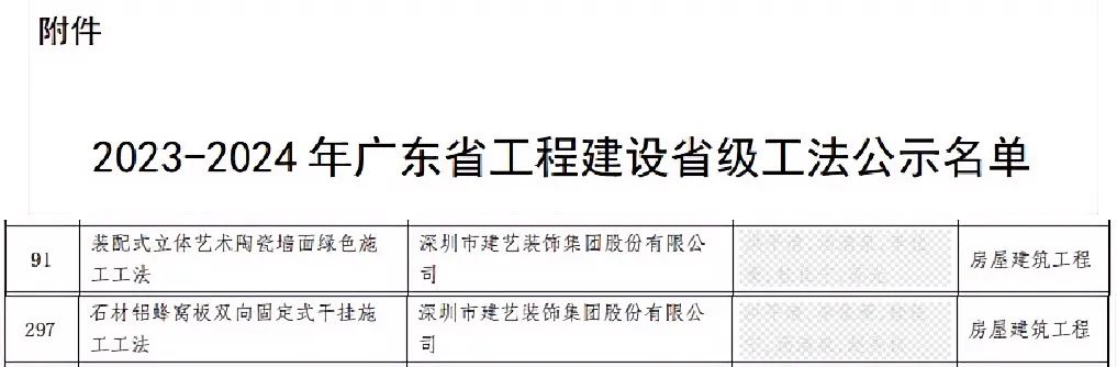 近日,由廣東省住房和城鄉建設廳組織開展的2023-2024年度工程建設省級工法評審結果正式公示。深圳市建藝裝飾集團股份有限公司(下稱建藝集團)創新研發的《裝配式立體藝術陶瓷墻面綠色施工工法》《石材鋁蜂窩板雙向固定式干掛施工工法》,成功獲評“2023-2024年度廣東省工程建設省級工法”。