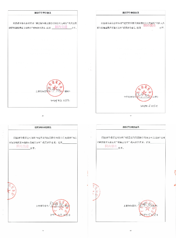 此外,建藝集團立足為項目施工解決重難點問題,自主創新研發的4項科技成果經廣東省建筑業協會評價委員會評定:《裝配式大面積密縫金屬吊頂施工技術》《石材鋁蜂窩板雙向固定式干掛施工技術》達到國內領先水平,《高大空間蜂窩吸音板墻面安裝技術》《新型抗堿防潮?;級γ婢G色施工技術》達到國內先進水平。