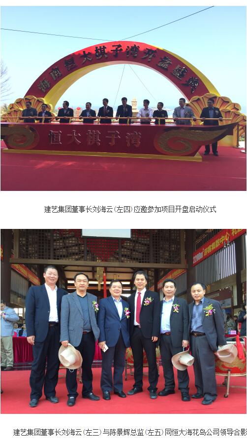 近日,經過前期的緊張施工,恒大海南棋子灣項目隆重開盤。建藝集團董事長劉海云、建藝集團監事會主席兼工程管理中心總監陳景輝等高管應邀參加了項目開盤暨合作單位錦旗頒發儀式。開盤儀式上,在鑼鼓喧天、煙花盛放的喜慶氛圍中,劉海云董事長與恒大海花島公司及其他單位領導共同推動了象征著正式開盤的推桿。期間,劉海云董事長還與恒大海花島公司董事長章為黨、總經理黃宏勇、副總經理朱心源、副總經理李國正等進行了親切友好的交談,雙方對于后續即將進行的海花島項目及棋子灣項目的合作事宜達成了共識。