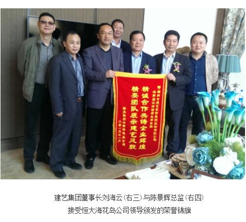 作為合作伙伴,海花島公司全體領導一致對建藝集團在前期合作中展現出的專業、誠信、創新、卓越的企業理念表示極大的認同,對項目部在施工過程中所表現出的不畏艱難、上下一心、能打仗、打硬仗、全力配合甲方的團隊精神表示高度贊揚,對于建藝集團工程人員能夠在如此極端艱苦的條件下,忘我的拼搏付出,以高度負責的敬業精神如期完成任務,保證了項目的開盤表示了感謝并向建藝集團頒發錦旗。