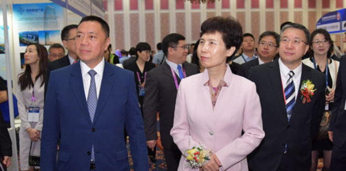 中國商務(wù)部高燕副部長、澳門特別行政區(qū)經(jīng)濟財政司梁維特司長和中國對外承包工程商會房秋晨會長于論壇開幕式前巡視展區(qū)