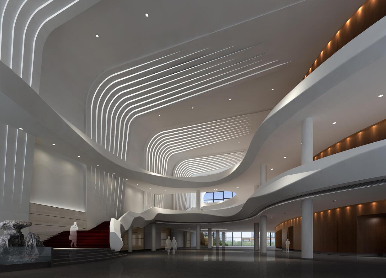 安徽廣電新中心西區大堂的室內設計是整體建筑中最具代表性的空間設計,大堂建筑空間恢宏大氣,三層空間挑高高達23米,主廳呈U形布局,三層流線型的回馬長廊貫穿之中,設計師充分挖掘了材質的特點,GRG材料造型欄板,打破了攔河給人的固有印象,創造性地使其展現扭曲變化的“韌性”造型,用抽象雕塑的手法表現了穿云破霧的“行龍”,仿佛有一種呼嘯著從遠處側廳奔騰而至的生命力,橫貫穿行在各空間里,充滿靈動和奮進的張力;體現出一種自由飄逸、奔放磅礴的氣勢;而與之呼應的是在側墻上三面巨大而舒展的翅形設計,暗藏的LED燈帶輝映其側,抽象地提煉出吉祥鳥“鳳凰”的翅膀形態,其與橫向穿行的“行龍”在豎向上相呼應,表現出一種龍興鳳舉、龍鳳呈祥的戲劇性效果,設計師通過對中國傳統元素的提煉及概括性的演繹,用現代、時尚的語素去表達主題,在空間視覺上給人強烈的沖擊力。