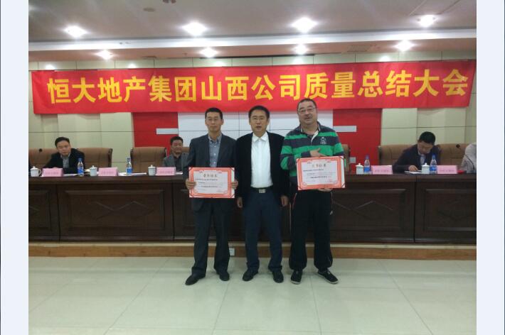 會上,恒大地產山西公司相關專家及領導對恒大山西區域所有合作單位(含裝修、土建、園林等)在2015年第一季度的質量、配合等方面工作進行了全面考評。在本次季度考評中,建藝集團負責恒大山西區域的彭武況項目部在施工過程中,敢于直面問題,克服諸多困難,確保了業主的各項進度節點指標如期完成,在質量方面更是達到了業主方的要求,榮獲了“工程質量優秀項目部”榮譽稱號,得到了山西恒大公司領導的高度贊揚。會議上恒大集團山西公司董事長向代表建藝集團參會的楊總頒發了獲獎證書,同時也對項目部全體人員提出了表彰,并表達了日后雙方開展深度合作的意向。