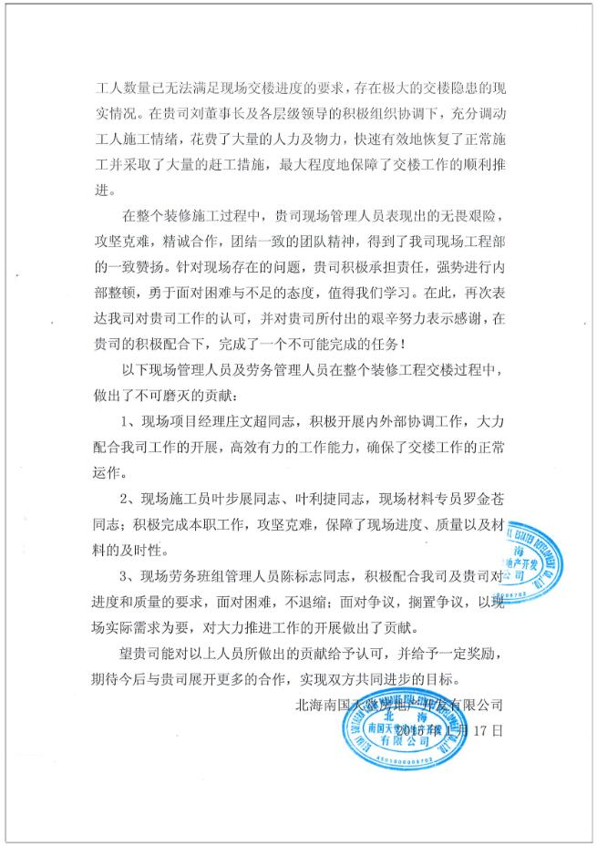 關于北海恒大御景半島首期11、12#樓室內精裝修工程的表揚信